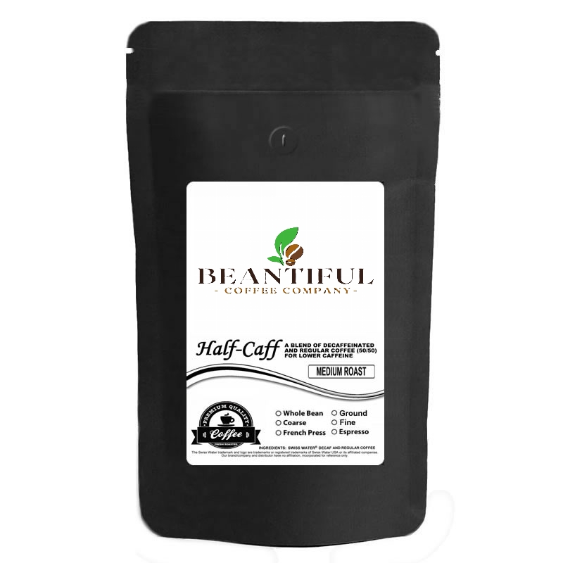 Half-Caff Low Caffeine Ground Coffee 5 LBS. Half-caff coffee is a blend of regular coffee and decaf coffee that has about half the amount of caffeine. It is a great option for people who enjoy coffee but are looking to reduce their caffeine intake. The resulting coffee is a balanced blend that has a similar taste to regular coffee, but with less caffeine.